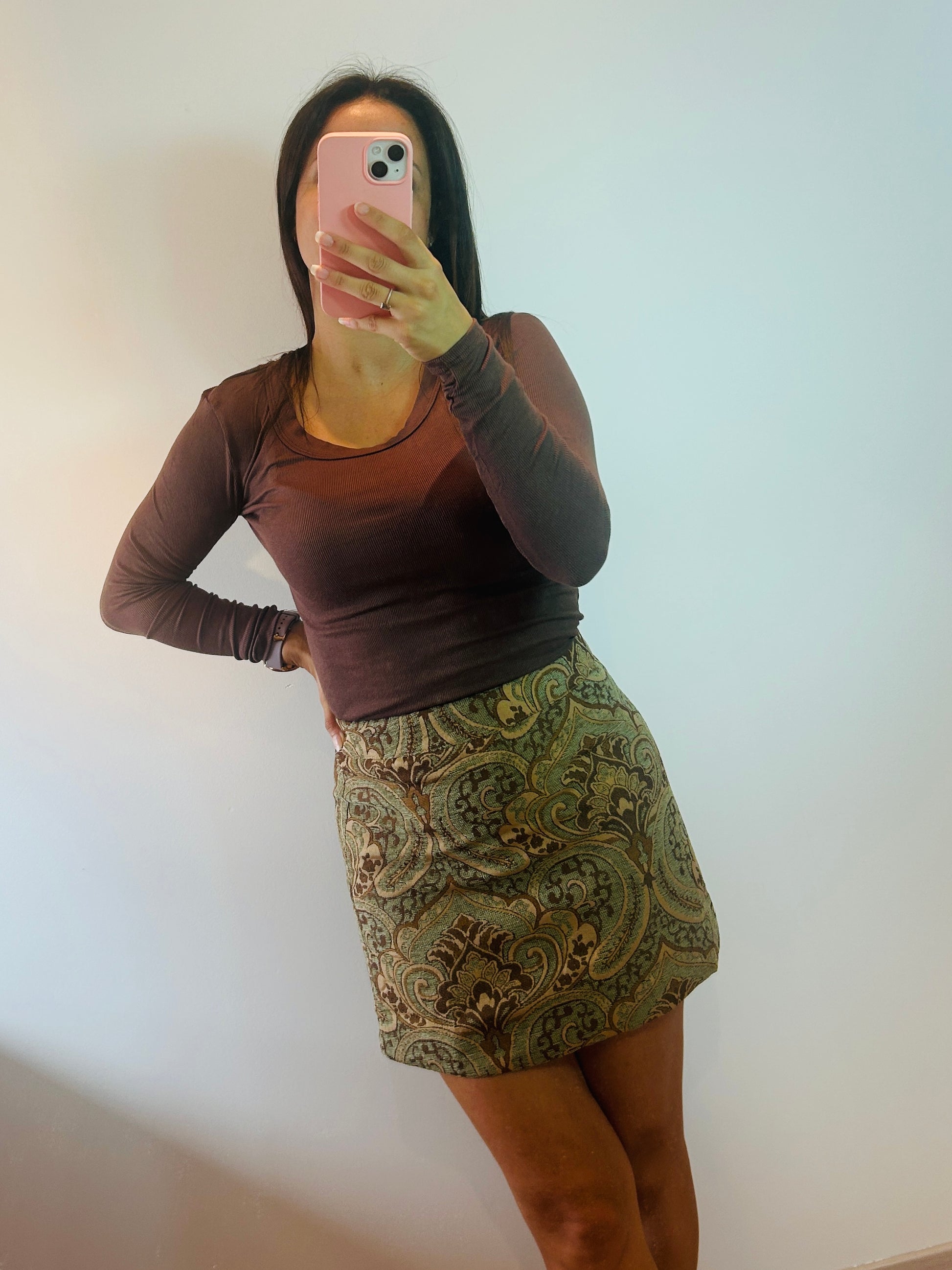 Deze minirok met een barokpatroontje is een echte eyecather. Draag 'm met een romantische blouse of een basic top.